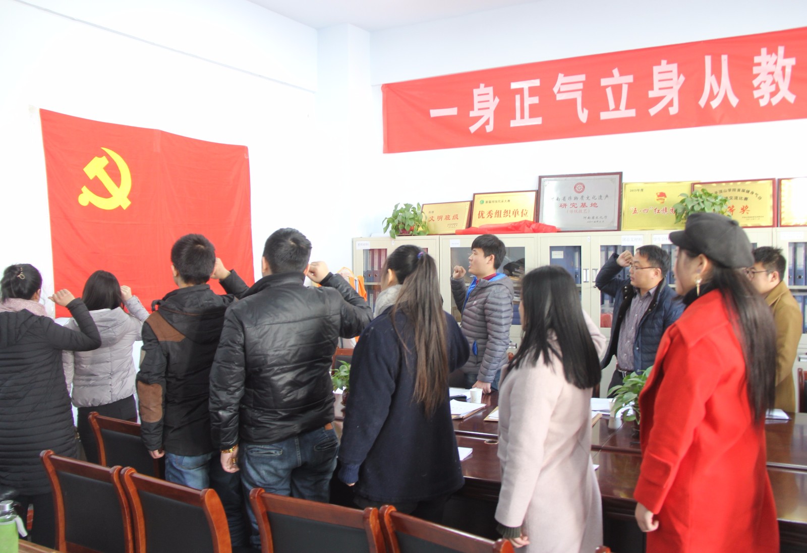 会上,五名预备党员对预备期一年内自己的思想、学习、工作、生活等情况做出了总结,并正确的认识了自己的缺点与不足,表明成为一名正式党员后,将不断地改善自身、提升自我。党小组组长向大会介绍转正人员在预备期间的教育和考察情况,党内同志认真倾听,并给予诚恳建议。大会中与会党员充分发表意见,同志们积极讨论,对转正人员逐一进行举手表决,超过半数以上的正式党员赞成接收尤传杰等五名同志的转正申请,同意转为正式党员,全体人员面对党旗宣誓,宣读入党誓词。