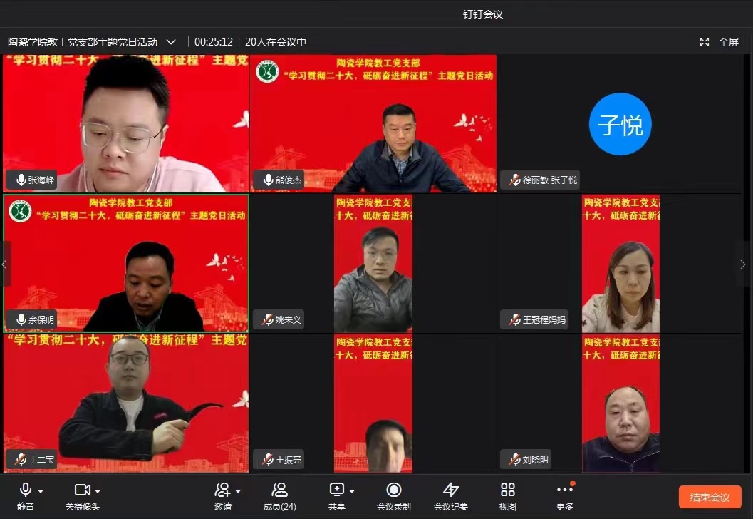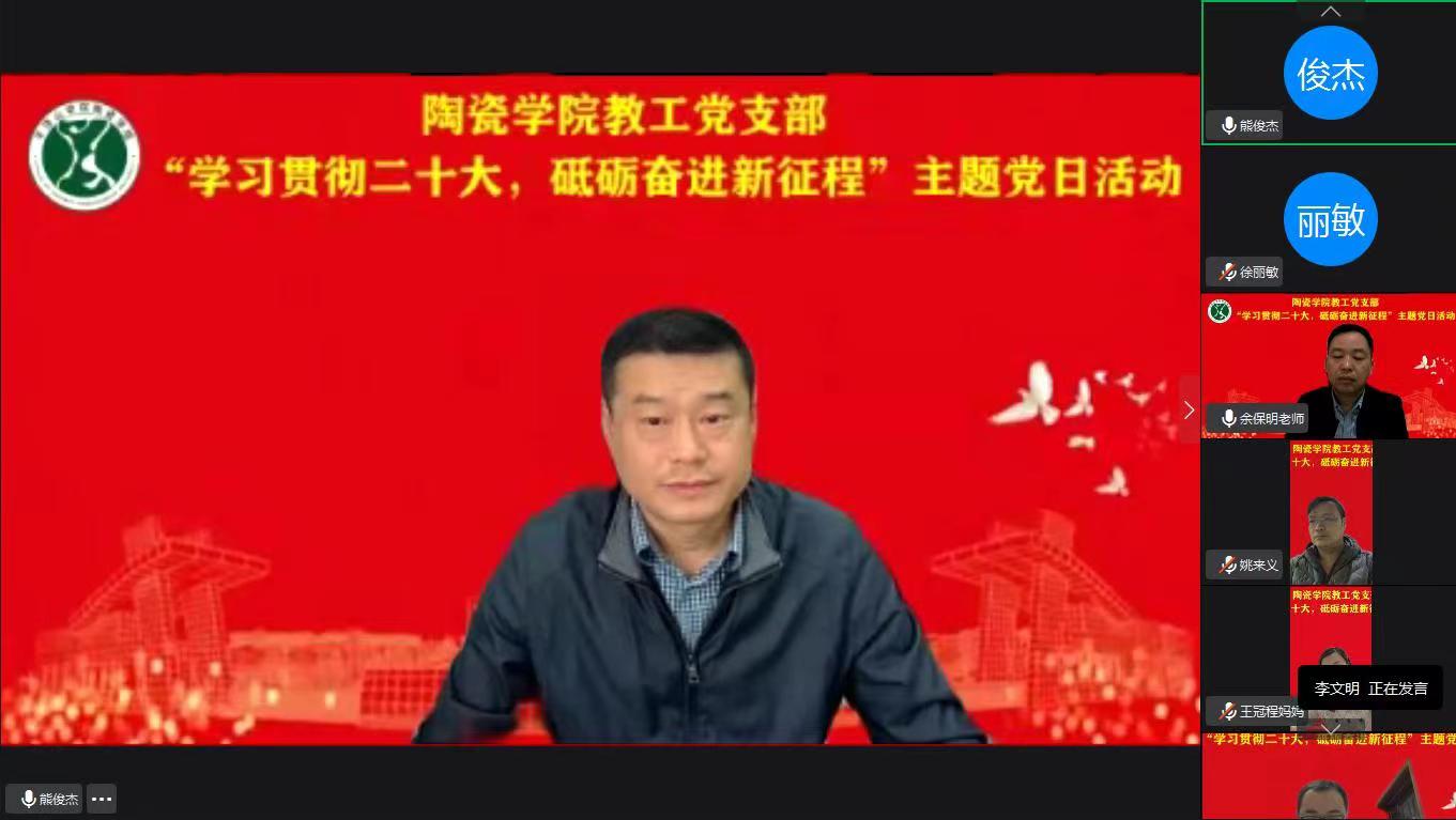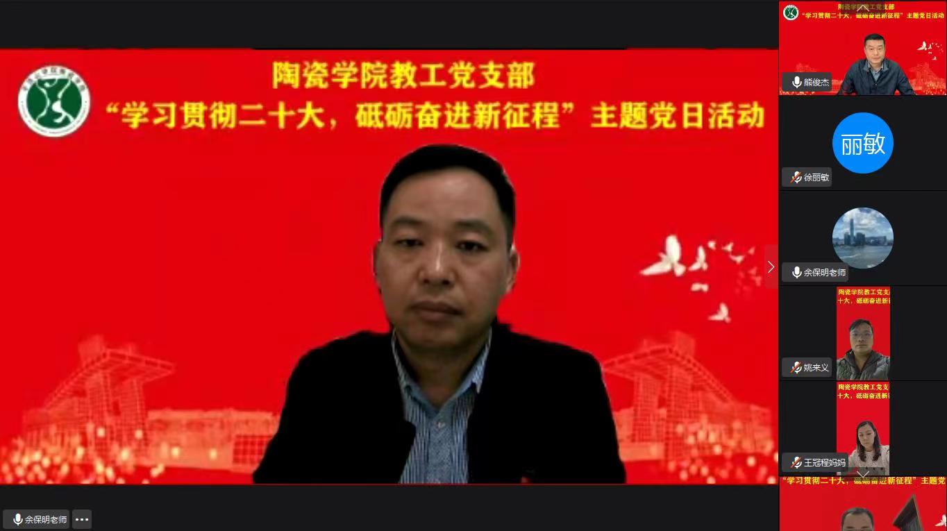 为深入学习贯彻党的二十大精神,进一步增强基层党组织的组织力、凝聚力和战斗力,激励广大党员充分发挥先锋模范作用。11月3日下午,tyc122ccvip教工党支部以线上会议的形式开展了“学习贯彻二十大,砥砺奋进新征程”的主题党日活动。会议由教工党支部书记余保明主持,全体教工党员参加会议。