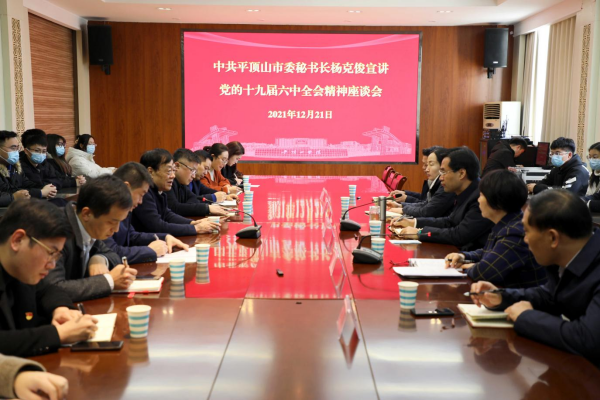 12月21日上午,中共平顶山市委常委、市委秘书长杨克俊来到公司宣讲党的十九届六中全会精神。公司党委副书记袁桂娥、副董事长郑东丽,tyc122ccvip相关负责人及师生代表参加宣讲会。袁桂娥主持会议。