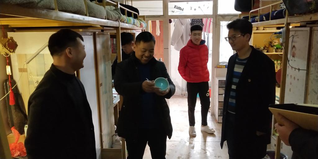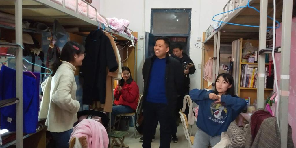 在走访过程中,余书记与同学们进行了亲切的交谈,了解同学们假期生活与返校的情况,以及过去的一年在学习和生活上遇到的问题,并鼓励同学们要确立目标,鼓足干劲,以饱满的精神状态投入到新学期的学习生活当中去。同时余书记一行还仔细查看宿舍的设施是否完备,倾听同学们提出的问题,提醒同学们增强安全意识,注意防火防盗,切实保障人身和财产安全。