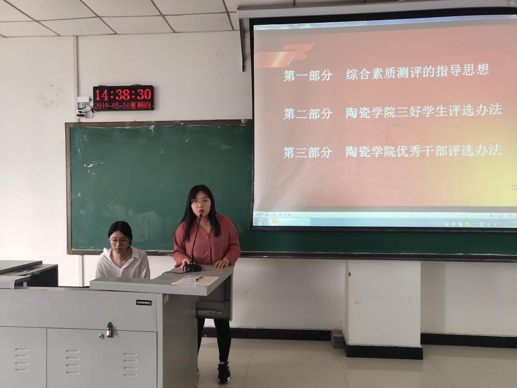 会上,张鄂同学主要围绕三好员工、优秀员工干部的评选条件、范围、程序等内容做了详细介绍。她强调,在学习的道路上,同学们要以诚信为主,严禁网络刷课等不良行为。随后,马延明老师做总结,他讲到,三好员工、优秀员工干部评选的目的旨在激励同学们积极向上、力争上游,希望同学们始终保有求知求学的热情,刻苦努力地学习专业知识,不断拓展自己的知识面,提升自身能力,在校期间能主动抓住机遇,为以后的生活与学习打下坚实而稳固的基础。