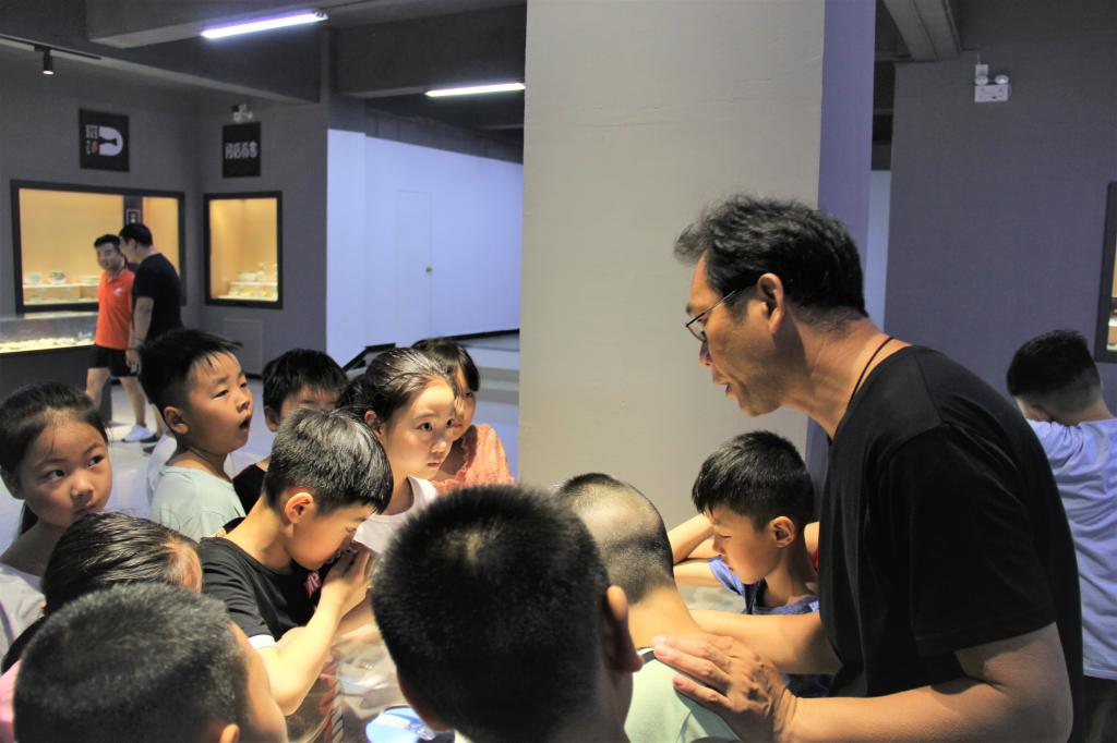 下午三点,孩子们抵达博物馆,志愿者带领孩子们参观了鲁山段店窑陶瓷系列展。参观过程中,志愿者向小朋友们讲解了鲁山花瓷从唐朝至元朝的发展历史以及主要特点。当大家走到展厅中央的羯鼓面前时,博物馆副馆长曾永生引用《羯鼓录》中“不是青州石末,即是鲁山花瓷”这一名句向孩子们介绍花瓷代表作——羯鼓 。他说道,在鲁山花瓷没出现以前,瓷器的釉色是南青北白的局面,是鲁山花瓷的出现打破了传统意义上的南青北白,使单色釉变成了双色釉,开创了后世彩瓷的先河,对中国陶瓷的发展有很大贡献。
