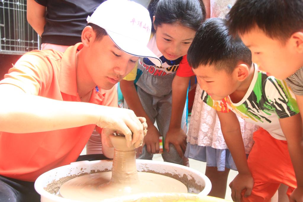 大手带着小手,一起转动指尖上的梦想,泥黄色的瓷泥在阳光下分外明亮。