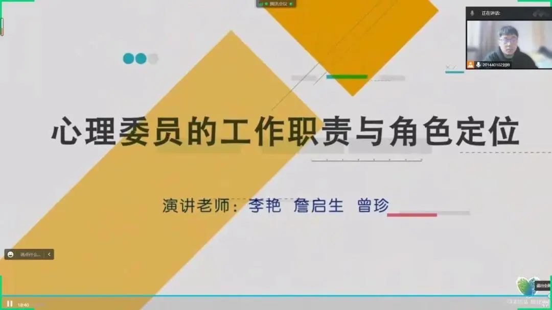 会议伊始,刘帅为大家介绍了心理委员的职责与角色定位,并指出了几种容易对心理健康产生的错误观点,以及心理健康的标准和不良状态的特点。