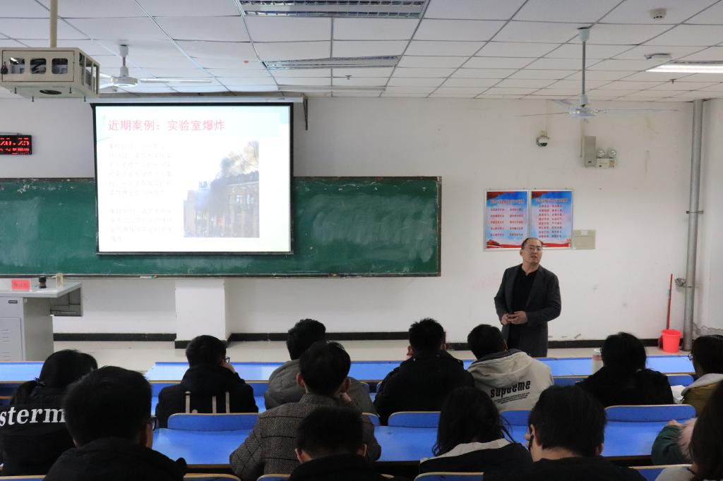 杨兴化博士从实验室事故类型、高校实验室常见事故原因分析、实验室一般安全知识、化学品知识、高压装置及气瓶管理五个方面进行讲解。杨博士结合近年来各地区的实验室安全事故谈到,事故中人为因素占98%,且多数安全事故的发生都是由于化学物品存储不当、使用危险气体有误等原因造成的。他强调,同学们要高度重视实验室危险品处置,严格管理,规范使用,从根源杜绝安全隐患,时刻把人身安全放在第一位。