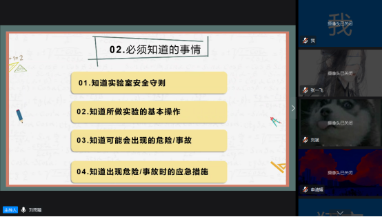 其次,刘雨瞳老师向大家介绍了在不同实验室大家需要注意、遵守的安全事项和行为规范,提醒同学们一定要保护好个人安全,遵守实验室规章制度、牢记各类危险品和警示标识,并为同学们提供了多种实验室突发事故处理方法。