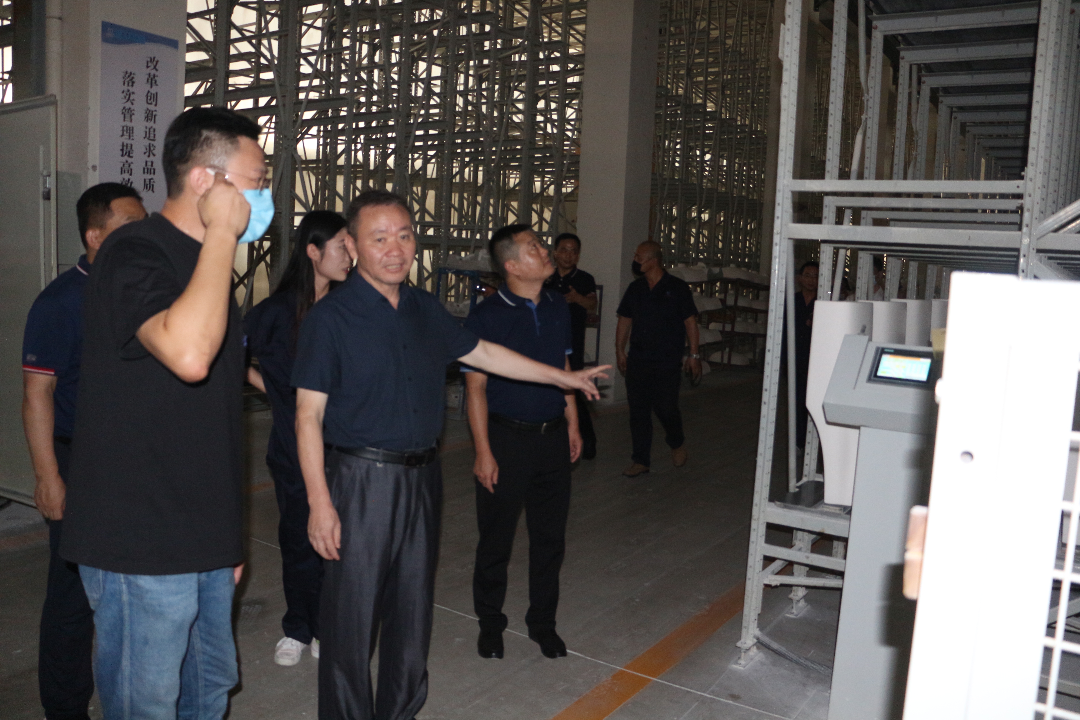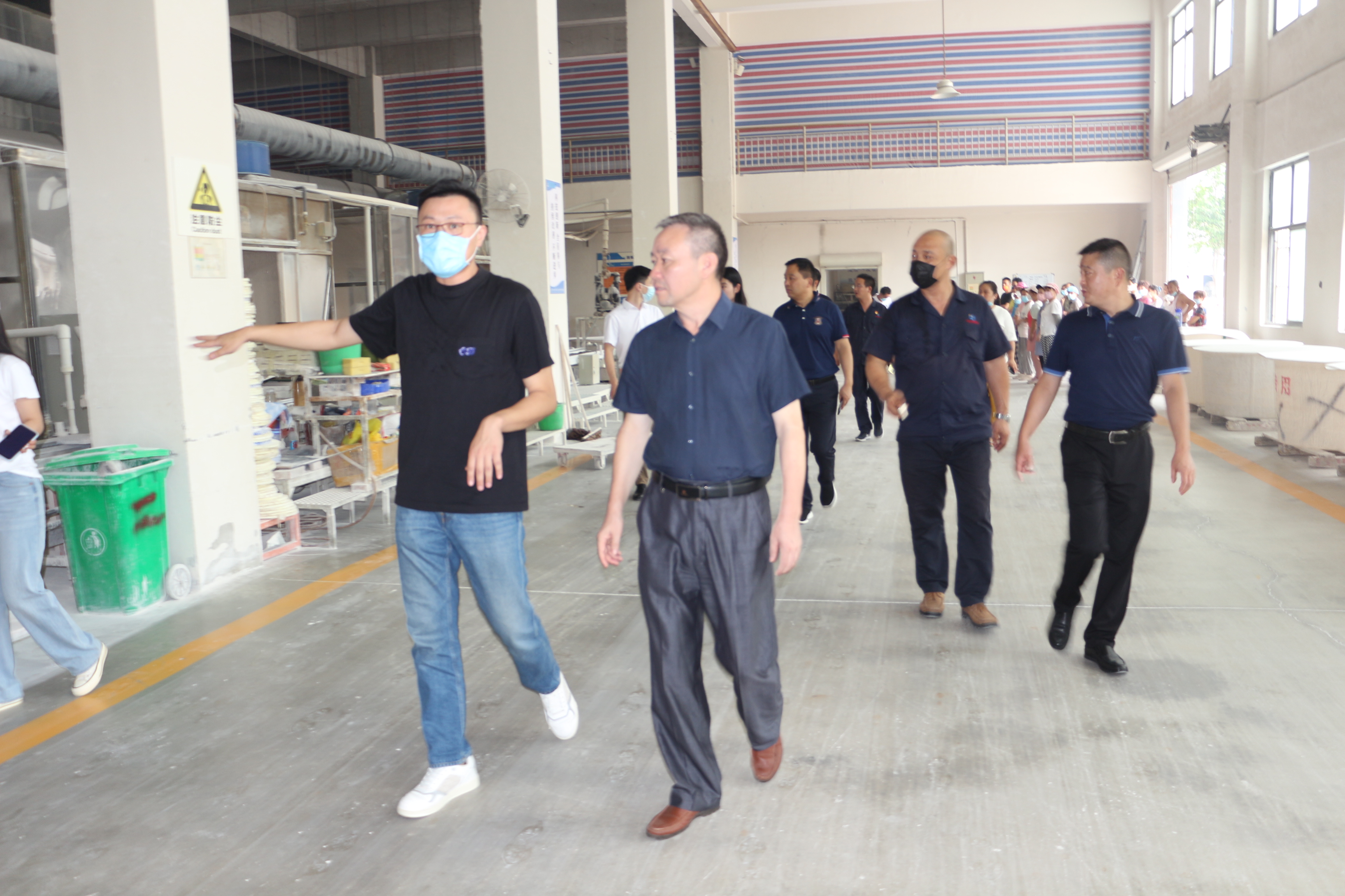来到河南洛多卫浴有限公司,在公司总经理侯晓军带领下,考察组深入厂区,先后到机器人循环施釉车间、智能码垛机器人车间、烧成车间、自动化包装线车间进行参观调研。