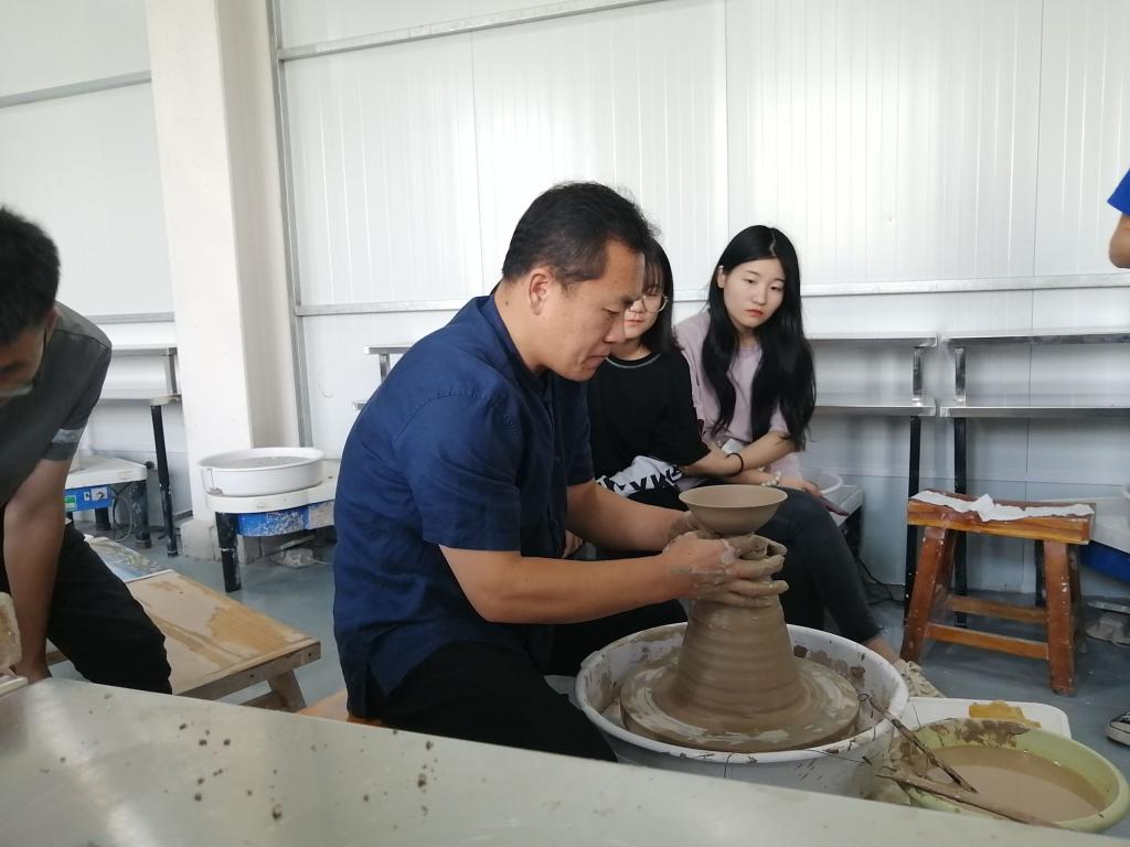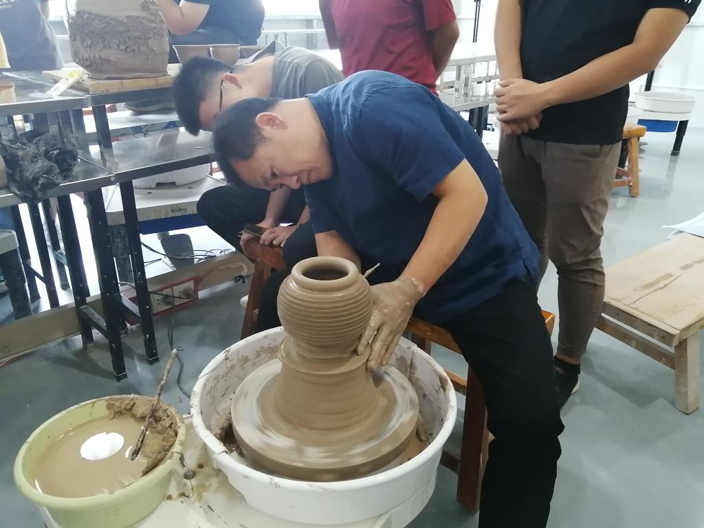 讲座结束后,李闻雷教授在tyc122ccvip实训创作工场向同学们展示拉坯技术,分享自己的独特技巧,并与同学们进行技术交流。